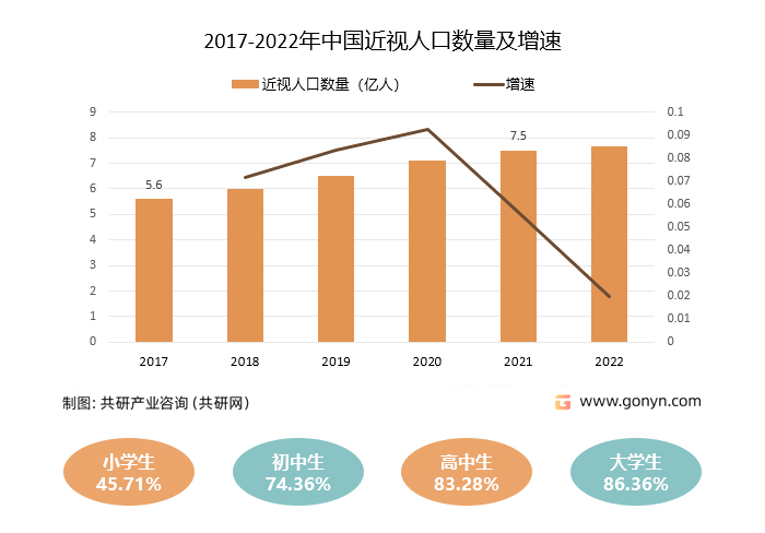 截止2020年,中国近视人口已达7.2亿,中国初中生、高中生和大学生的近视率均已超过8成。2017年我国眼镜零售市场规模就已经达到了730亿元,2020年将达到850亿元。