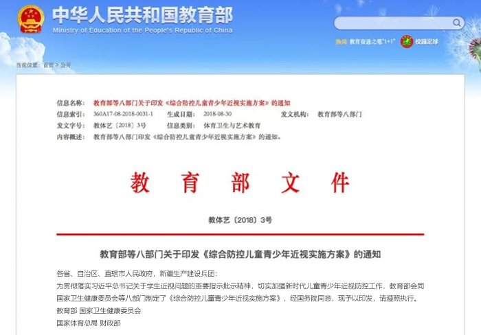 2018年8月,教育部等八部门联合印发了《综合防控儿童青少年近视实施方案》,明确了儿童青少年近视防控的目标,以及家庭、学校、医疗卫生机构、学生、政府相关部门应采取的防控措施,呼吁全社会行动起来,共同呵护好孩子的眼睛
