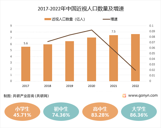 根据调查显示,截止2020年,中国近视人口已达7.2亿,中国初中生、高中生和大学生的近视率均已超过8成,并逐年增加,呈现低龄化重度化发展趋势。
